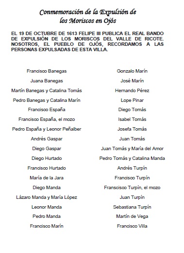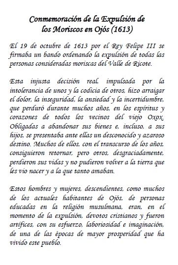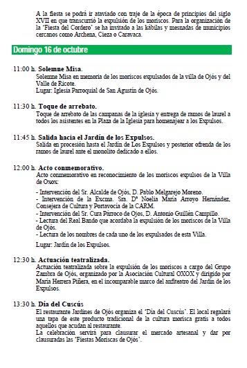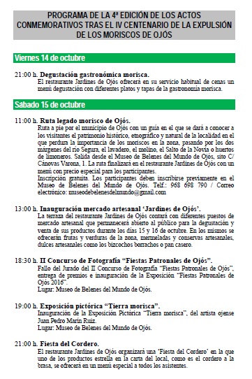 Estimados amigos y amigas, con motivo de la 4 edición del V Centenario de la expulsión de los moriscos del Valle en Ojos, tenemos el gusto de invitaros a los actos que se van al celebrar del 14 de Octubre al 16 de Octubre en Ojos.