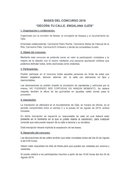 CONCURSO: "DECORA TU CALLE, ENGALANA OJÓS" Detalles Categoría de nivel principal o raíz: Fiestas 2019 Categoría: Fiestas Patronales 2019 Publicado: Jueves, 01 Agosto 2019 20:50 Visto: 15148 Anterior