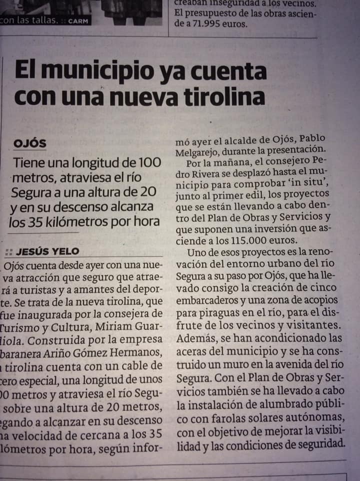 El viernes 1 de marzo, fue inaugurada la nueva tirolina del solvente por la Consejera de Turismo y Cultura, Miriam Guardiola y nuestro alcalde Pablo Melgarejo. Cuenta con una longitud de más de 100 m y atraviesa el río a una altura de 20 m.