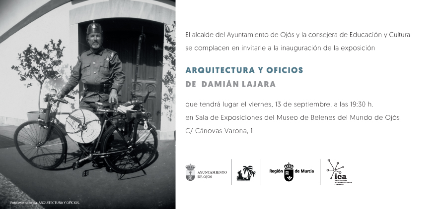 Invitación a la exposición ARQUITECTURA Y OFICIOS de Damián Lajara, que tendrá lugar el viernes 20 de septiembre de 2019 en el Museo de Belenes del Mundo.