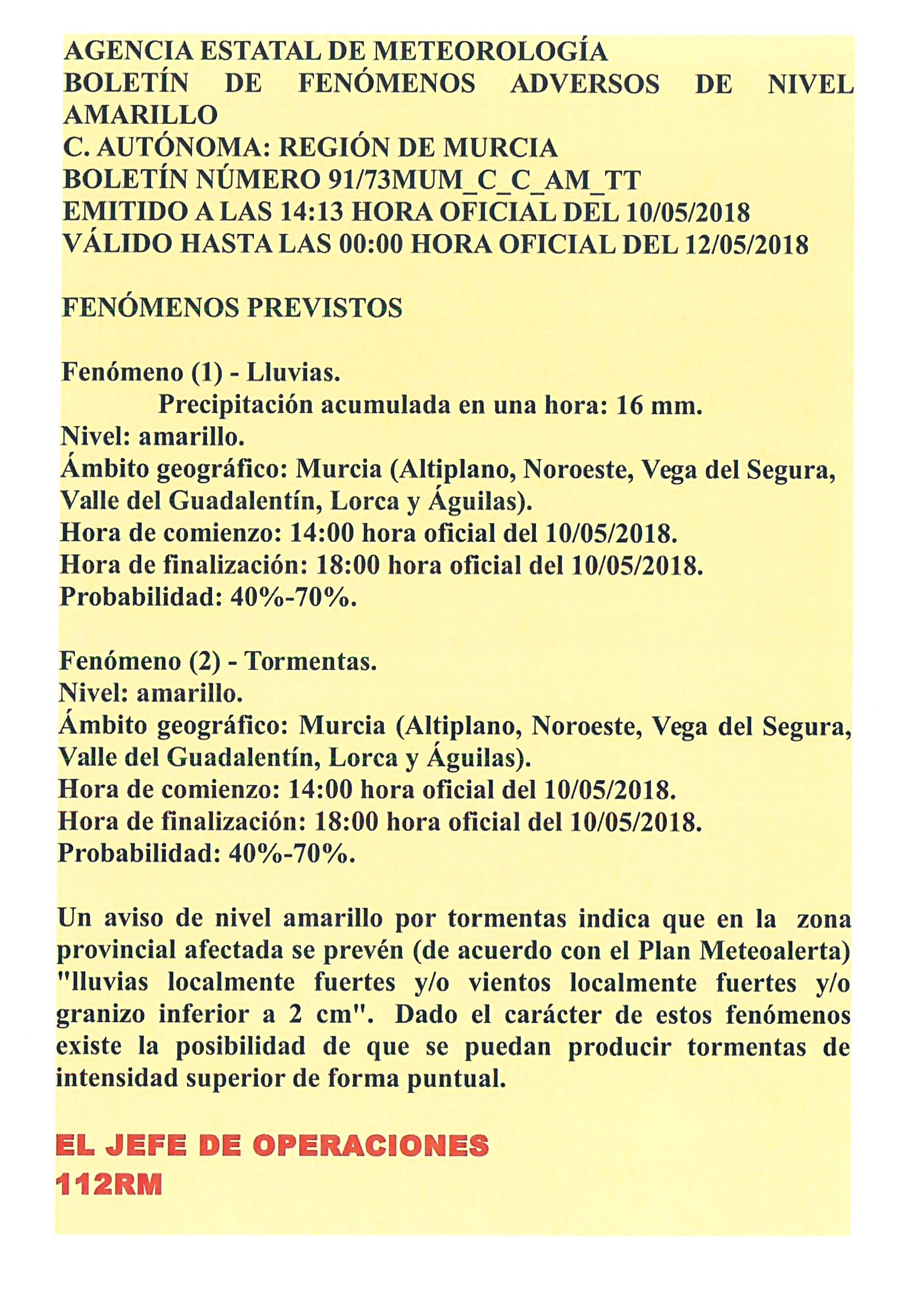 BOLETÍN DE FENÓMENOS ADVERSOS DE NIVEL AMARILLO Detalles Categoría de nivel principal o raíz: 8.-Información y Atención al Ciudadano Categoría: 8.3.-Participación Ciudadana Publicado: Jueves, 10 Mayo 2018 16:08 Visto: 164211 Anterior Siguiente