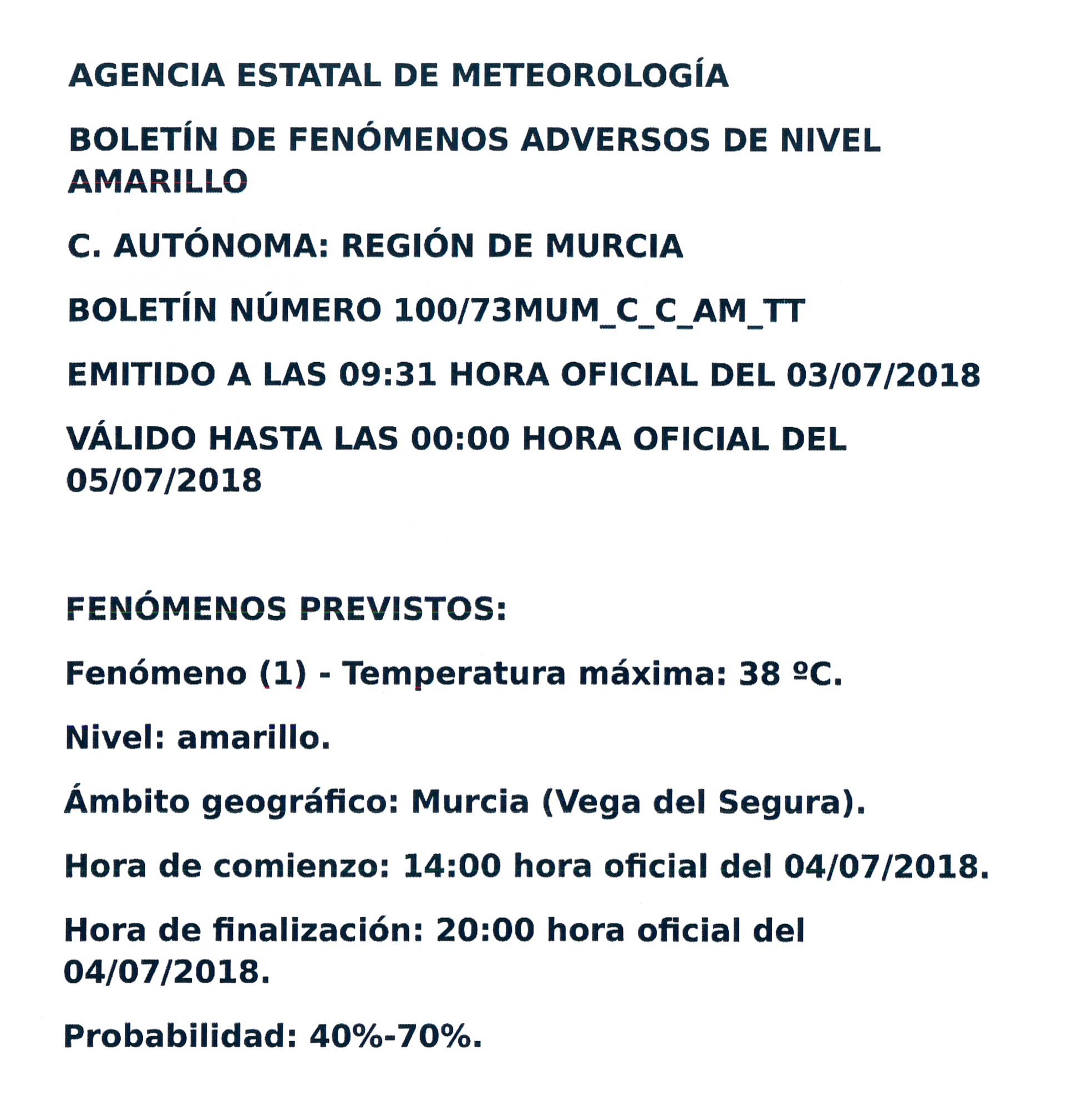 ALERTA POR ALTAS TEMPERATURAS Detalles Categoría de nivel principal o raíz: 8.-Información y Atención al Ciudadano Categoría: 8.3.-Participación Ciudadana Publicado: Martes, 03 Julio 2018 14:02 Visto: 159020 Anterior Siguiente
