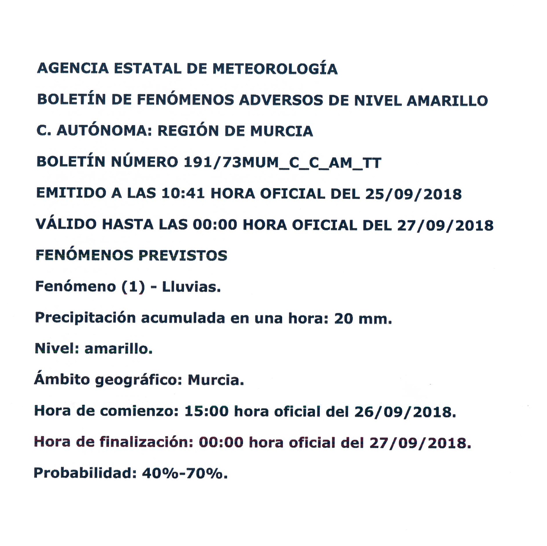ALERTA POR FENOMENÓS ADVERSOS DE NIVEL AMARILLO Detalles Categoría de nivel principal o raíz: 8.-Información y Atención al Ciudadano Categoría: 8.3.-Participación Ciudadana Publicado: Martes, 25 Septiembre 2018 20:17 Visto: 53732 Anterior Siguiente