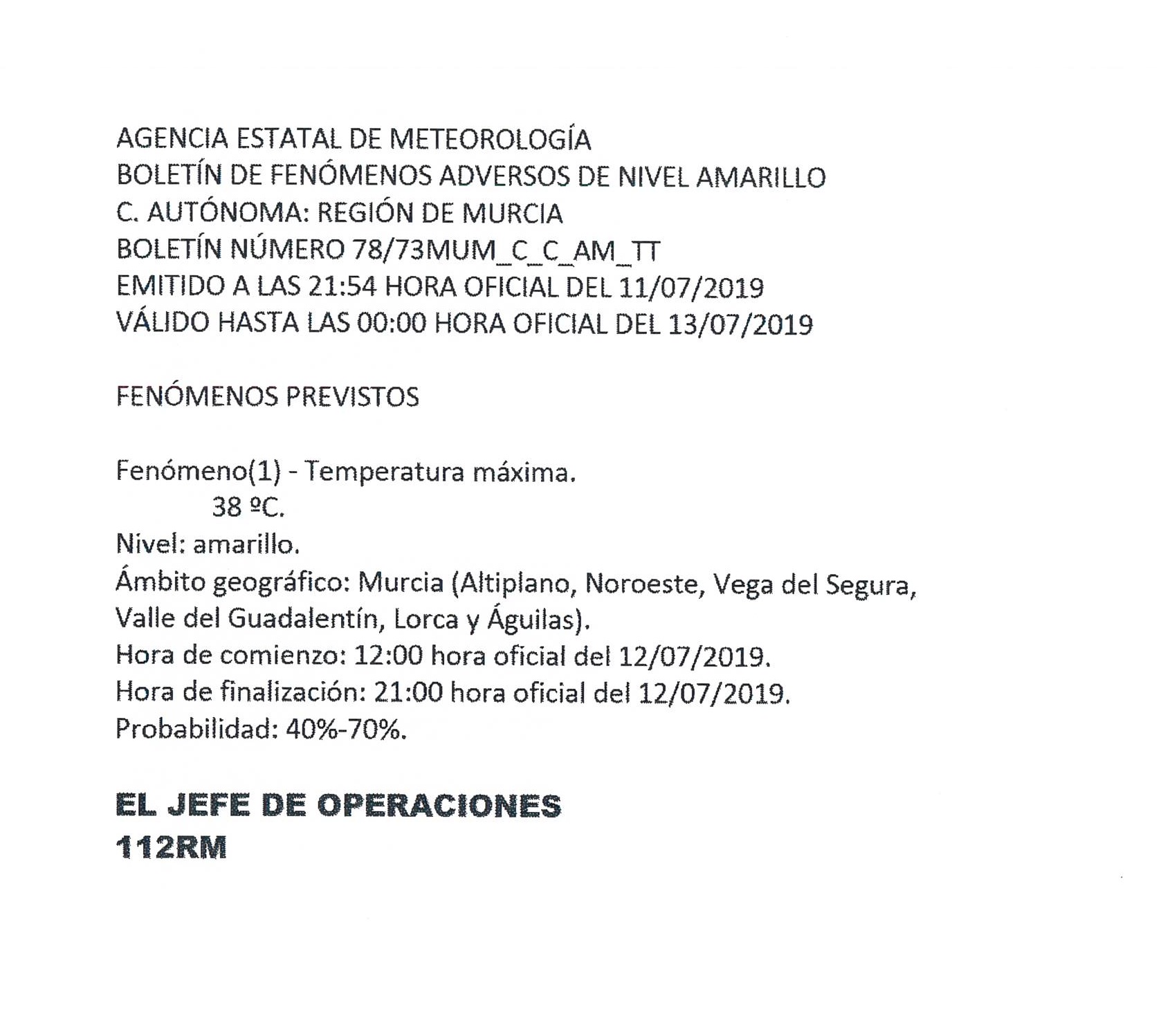 AVISO DE NIVEL AMARILLO - ALTAS TEMPERATURAS Detalles Categoría de nivel principal o raíz: 8.-Información y Atención al Ciudadano Categoría: 8.3.-Participación Ciudadana Publicado: Viernes, 12 Julio 2019 12:46 Visto: 23435 Anterior Siguiente