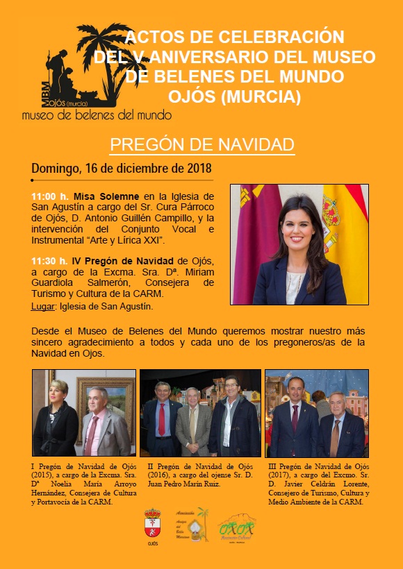 Leer más: INAUGURADA LA NUEVA TIROLINA DEL SOLVENTEIV Pregón de Navidad de Ojós, a cargo de la Excma. Sra. Dª. Mirian Guardiola Salmerón, Consejera de Turismo y Cultura de la CARM, intervención del Conjunto Vocal e Instrumental "Arte y Lírica XXI" y posterior visita al Museo de Belenes del Mundo.