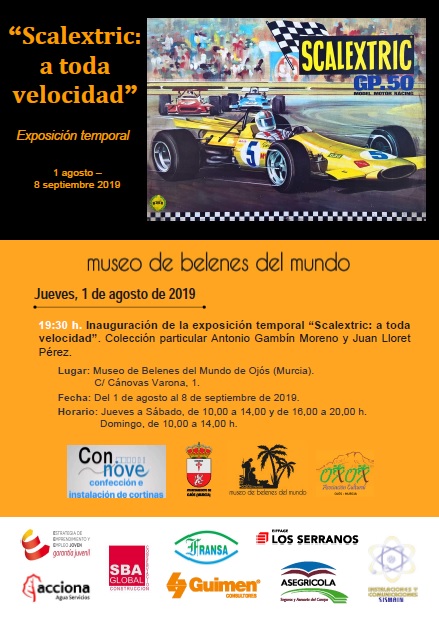 El pasado jueves, 1 de agosto, fue inaugurada la Exposición, "Scalextric: A toda velocidad", por nuestro, Alcalde José Emilio Palazón e Inmaculada Nieto Talón, Concejala en materia de Educación y Formación, Cultura y Turismo, Policía Local y Seguridad Ciudadana y Urbanismo.