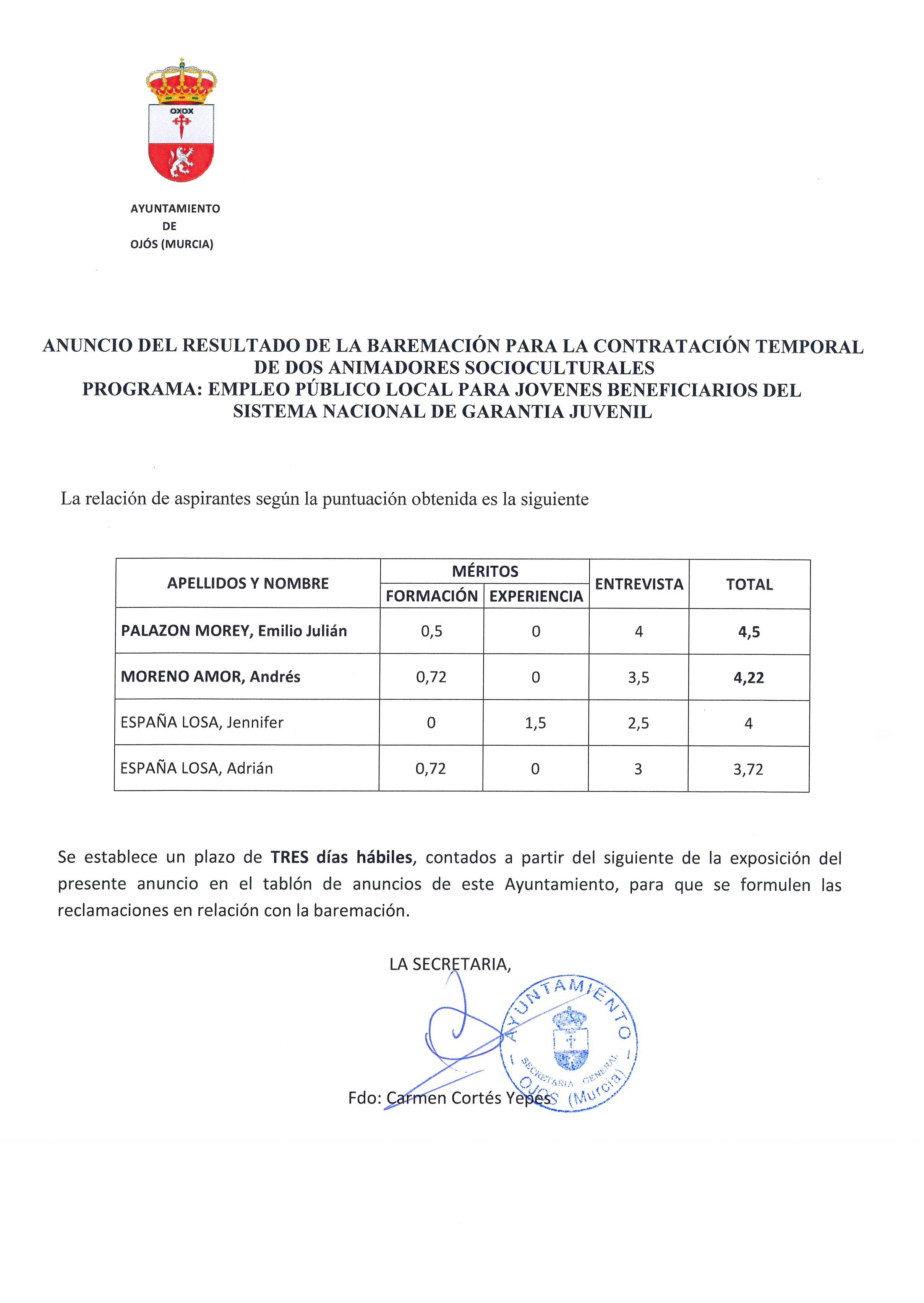 ANUNCIO DEL RESULTADO DE LA BAREMACIÓN PARA LA CONTRATACIÓN TEMPORAL DE DOS ANIMADORES SOCIOCULTURALES