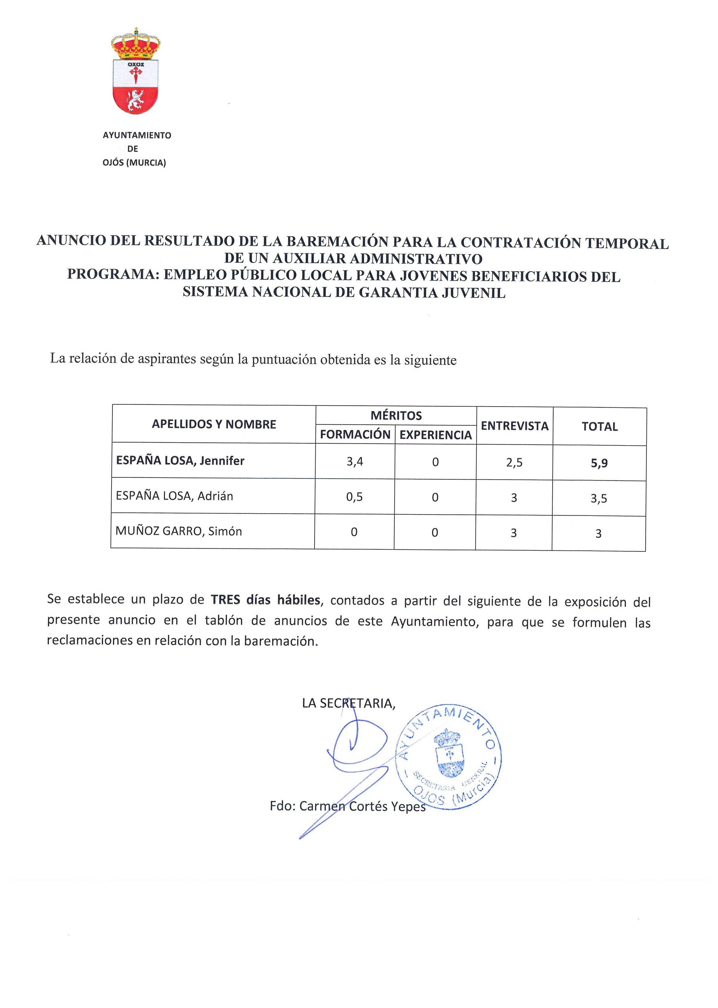 ANUNCIO DEL RESULTADO DE LA BAREMACIÓN PARA LA CONTRATACIÓN TEMPORAL DE UN AUXILIAR ADMINISTRATIVO