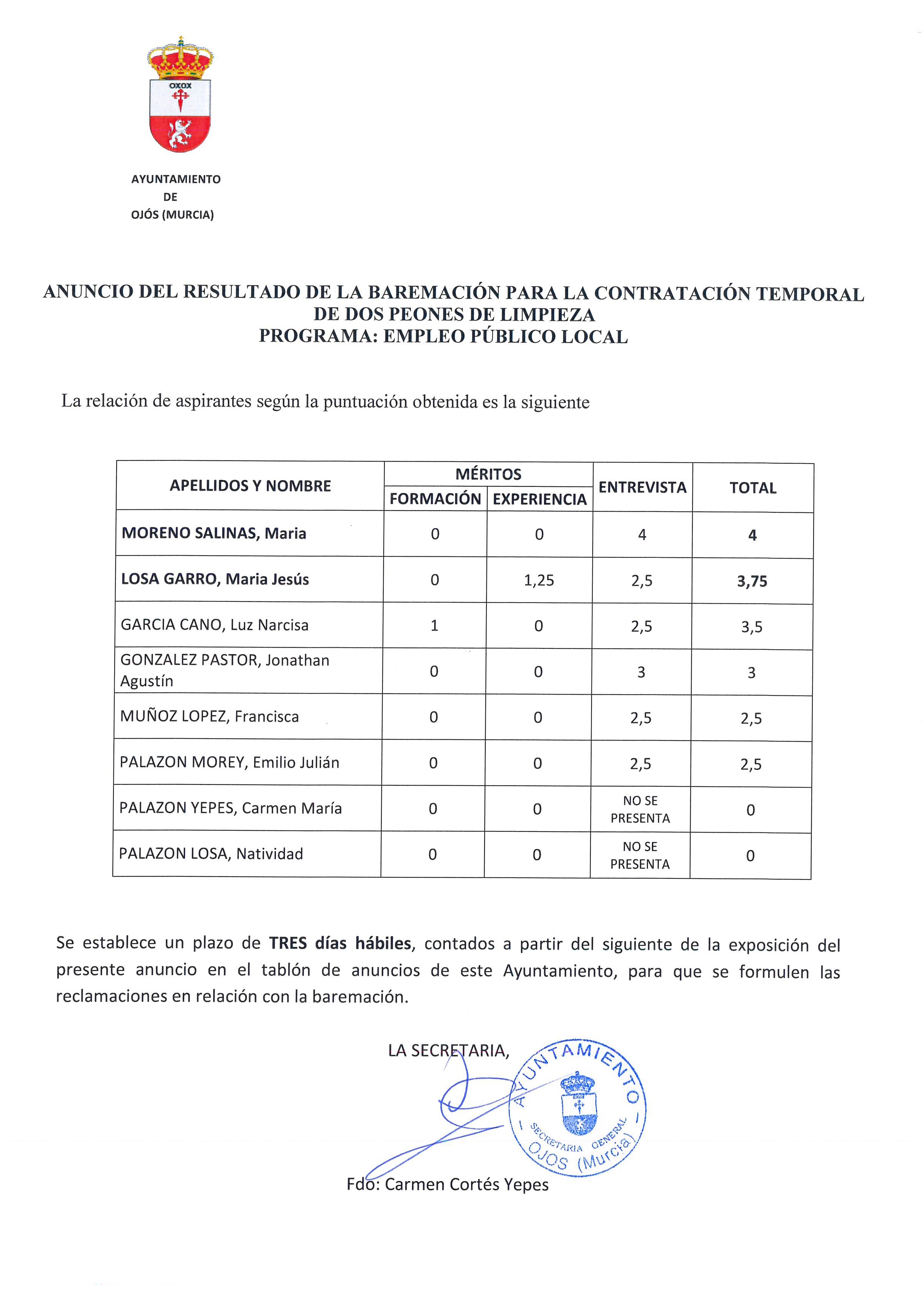 ANUNCIO DEL RESULTADO DE LA BAREMACIÓN PARA LA CONTRATACIÓN TEMPORAL DE DOS PEONES DE LIMPIEZA