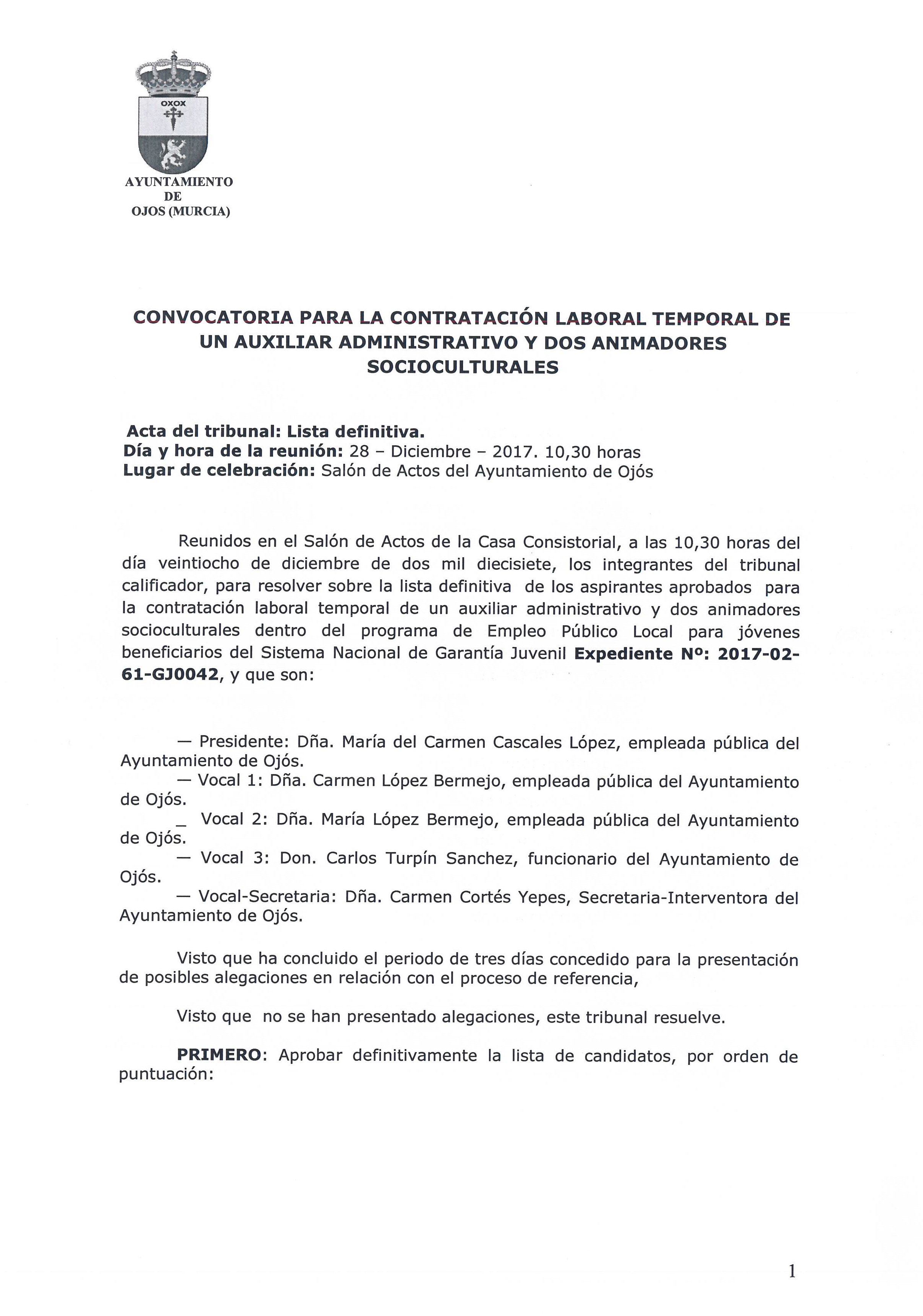 LISTA DEFINITIVA APROBADOS CONTRATACIÓN UN AUXILIAR ADMINISTRATIVO Y DOS ANIMADORES SOCIOCULTURALES