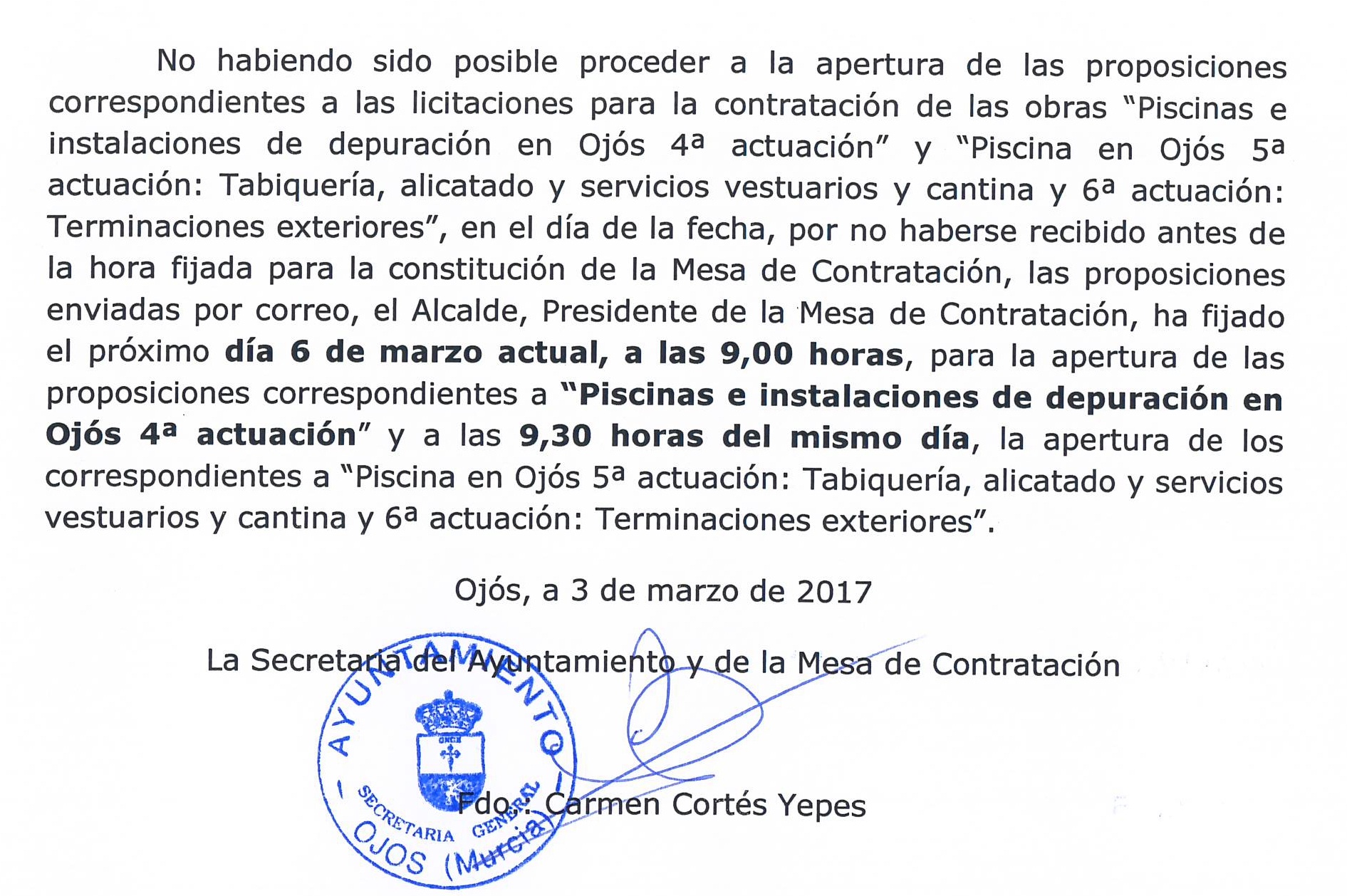 Hoy viernes 17 de febrero de 2017 aparecen publicados en el Boletín Oficial de la REGIÓN DE MURCIA, los anuncios de licitación de contratación de obras de piscina e instalaciones de depuración en Ojós 4.ª actuación y licitación de contratación de las obras de piscina en Ojós 5.ª actuación: Tabiquería, alicatado y servicios vestuarios y cantina y 6.ª actuación: terminación exteriores.